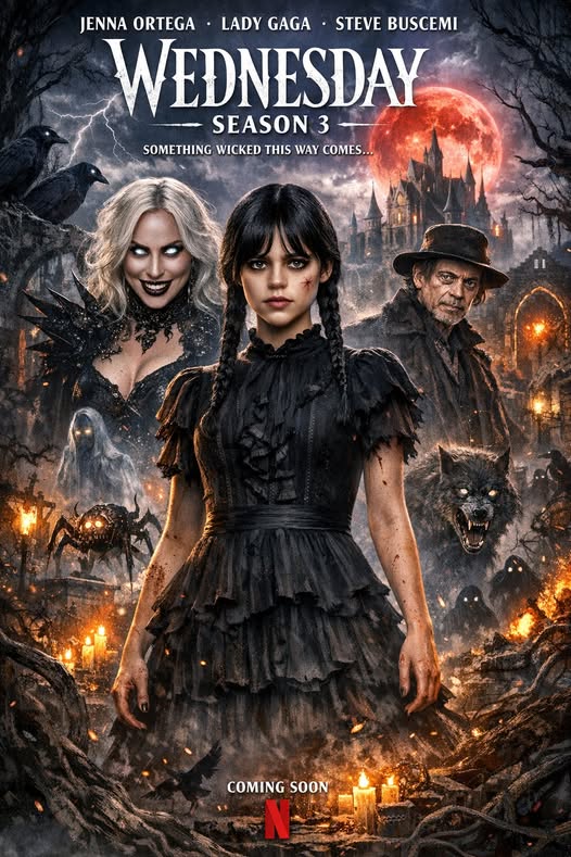 Jenna Ortega’s Wednesday Addams is sharper than a guillotine blade—deadpan stare upgraded to lethal, cello in hand like a weapon of mass melancholy. After Nevermore’s chaos, the Addams estate becomes ground zero for “accidental” deaths that smell suspiciously like ritual. Enter Lady Gaga as the high-fashion occultist: all velvet drama, razor wit, and “Mother Monster” energy that turns every scene into a gothic runway showdown. Their chemistry? Poisonous perfection—Wednesday’s ice meeting Gaga’s fire in clashes that spark like black magic.