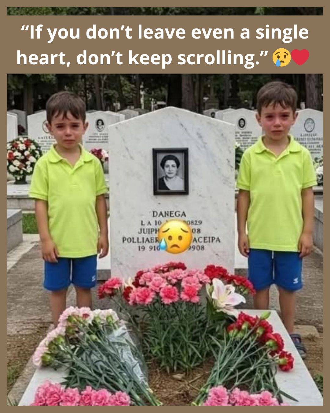 In the quiet sanctuary of the cemetery, where the world slows to a crawl and the air is heavy with the scent of freshly cut grass, two small figures stand as a heartbreaking testament to resilience. They are just children—at an age where their primary concerns should be the height of a grass hill or the speed of a ball—yet their eyes possess a depth of sorrow that belongs to a much older soul. Their tiny hands rest upon a cold stone, a physical barrier that marks the resting place of the woman who was, and remains, their entire world.