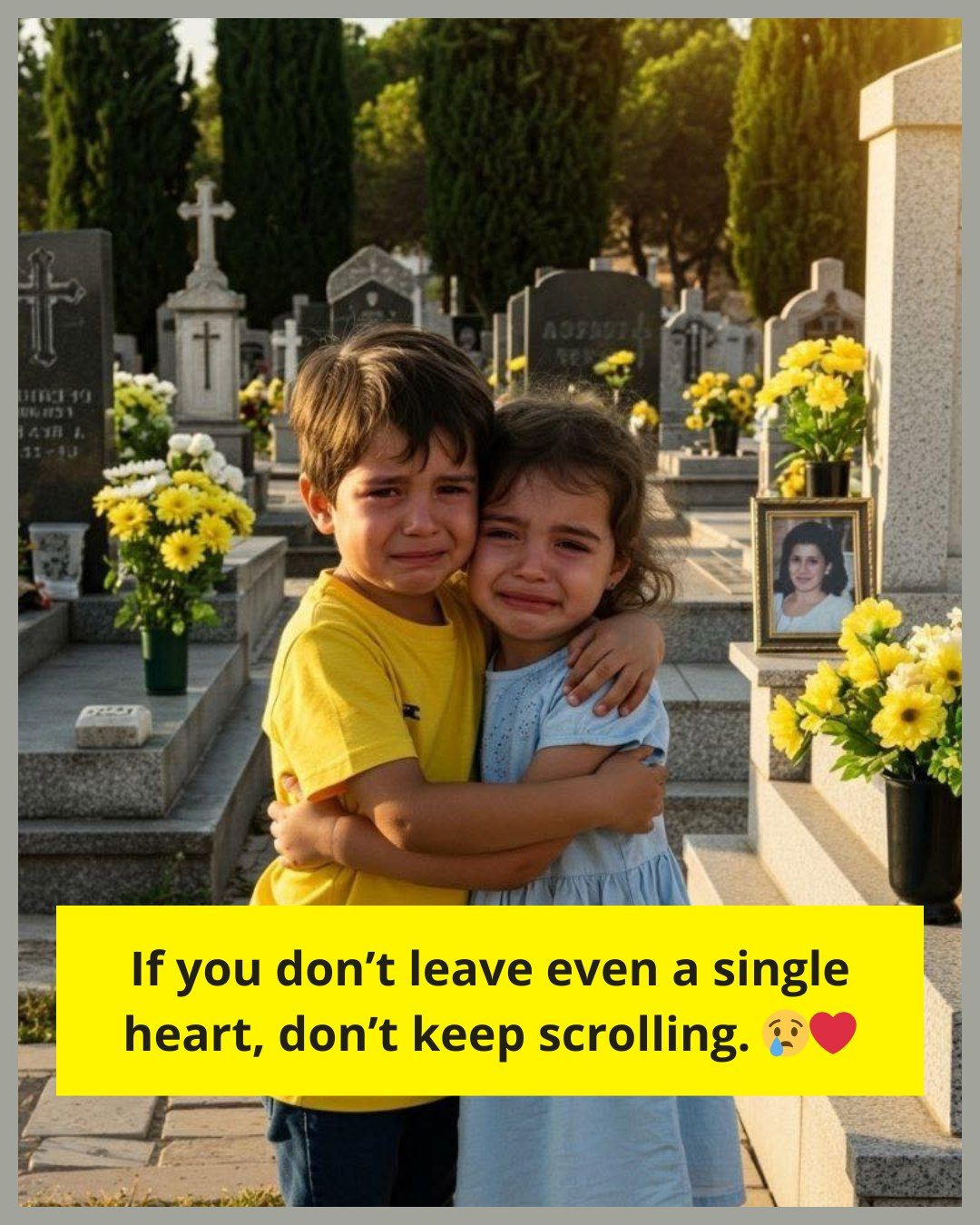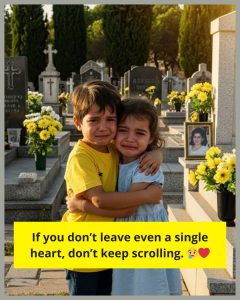 In the quiet sanctuary of the cemetery, where the world slows to a crawl and the air is heavy with the scent of freshly cut grass, two small figures stand as a heartbreaking testament to resilience. They are just children—at an age where their primary concerns should be the height of a grass hill or the speed of a ball—yet their eyes possess a depth of sorrow that belongs to a much older soul. Their tiny hands rest upon a cold stone, a physical barrier that marks the resting place of the woman who was, and remains, their entire world.