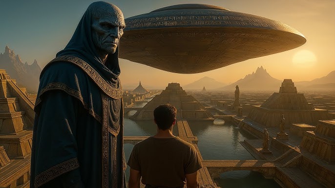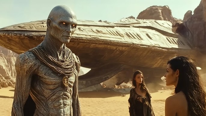 The visuals are breathtaking and unsettling: golden ziggurats rising under alien skies, bioluminescent DNA strands twisting in primordial vats, vast mining operations carved into African mountainsides while primitive hominids stare upward in awe and terror. The Anunnaki themselves are rendered with eerie realism—tall, elongated, luminous, never fully humanoid yet unmistakably intelligent and utterly indifferent to the suffering they engineer.