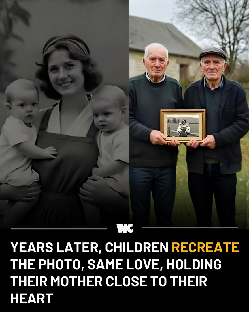 In 2025, those same twin boys returned as elderly men, standing in the very same place and holding that treasured photo from their childhood 🕰️✨. Side by side, they proved that while time may change faces and bend bodies, a mother’s love remains untouched by the years.