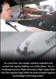 Flight attendant Nigel Ogden was entering the cockpit just as the blowout occurred. Seeing his captain disappearing through the hole in the aircraft, Ogden acted on pure instinct. He lunged forward and grabbed Lancaster by the belt, anchoring himself to the captain’s seat.
