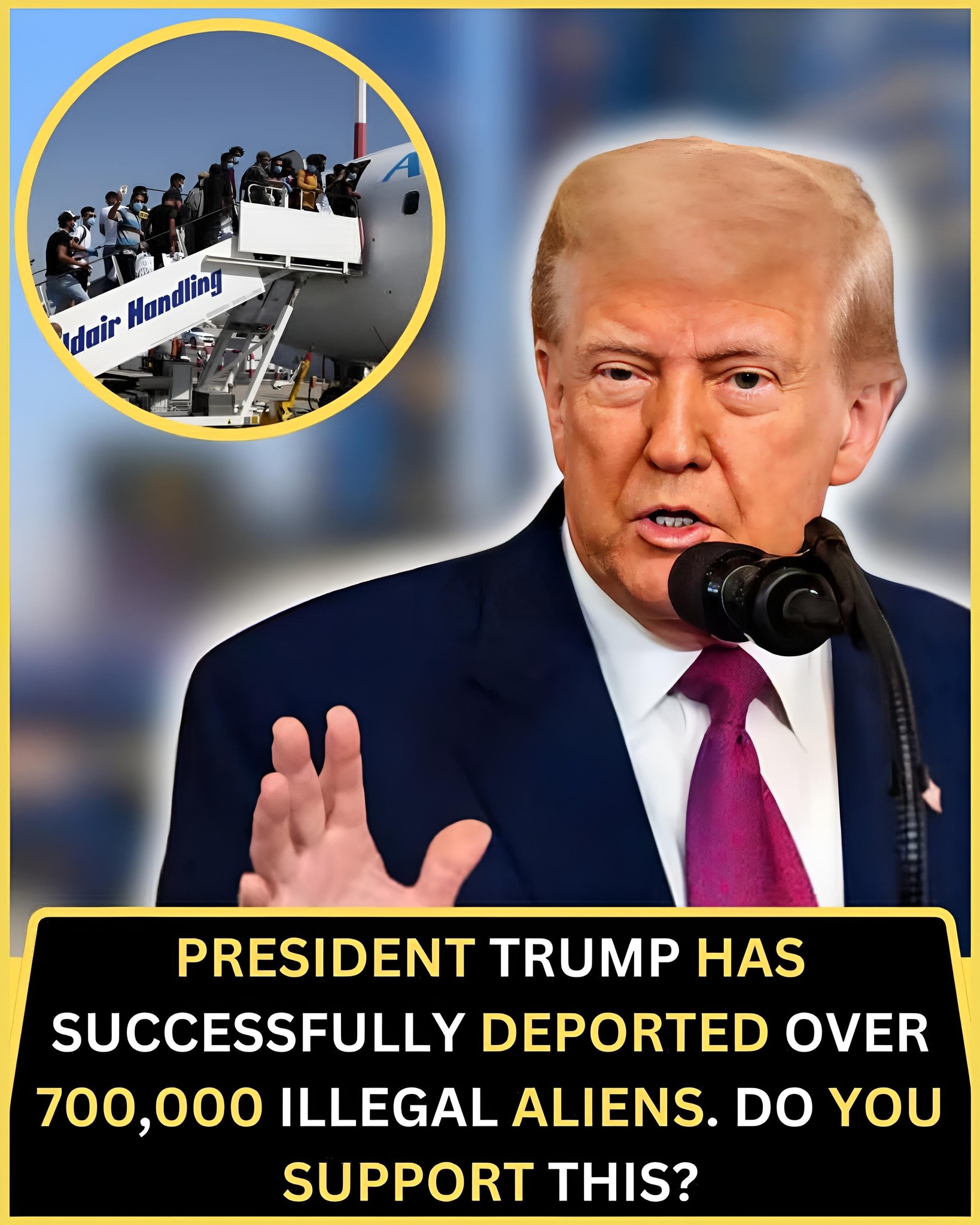 Donald Trump leans into the microphone, one hand raised as if delivering a verdict. In the corner, a packed staircase of people boarding a plane captures the human cost behind the headline claim: “President Trump has successfully deported over 700,000 illegal aliens. Do you support this?”