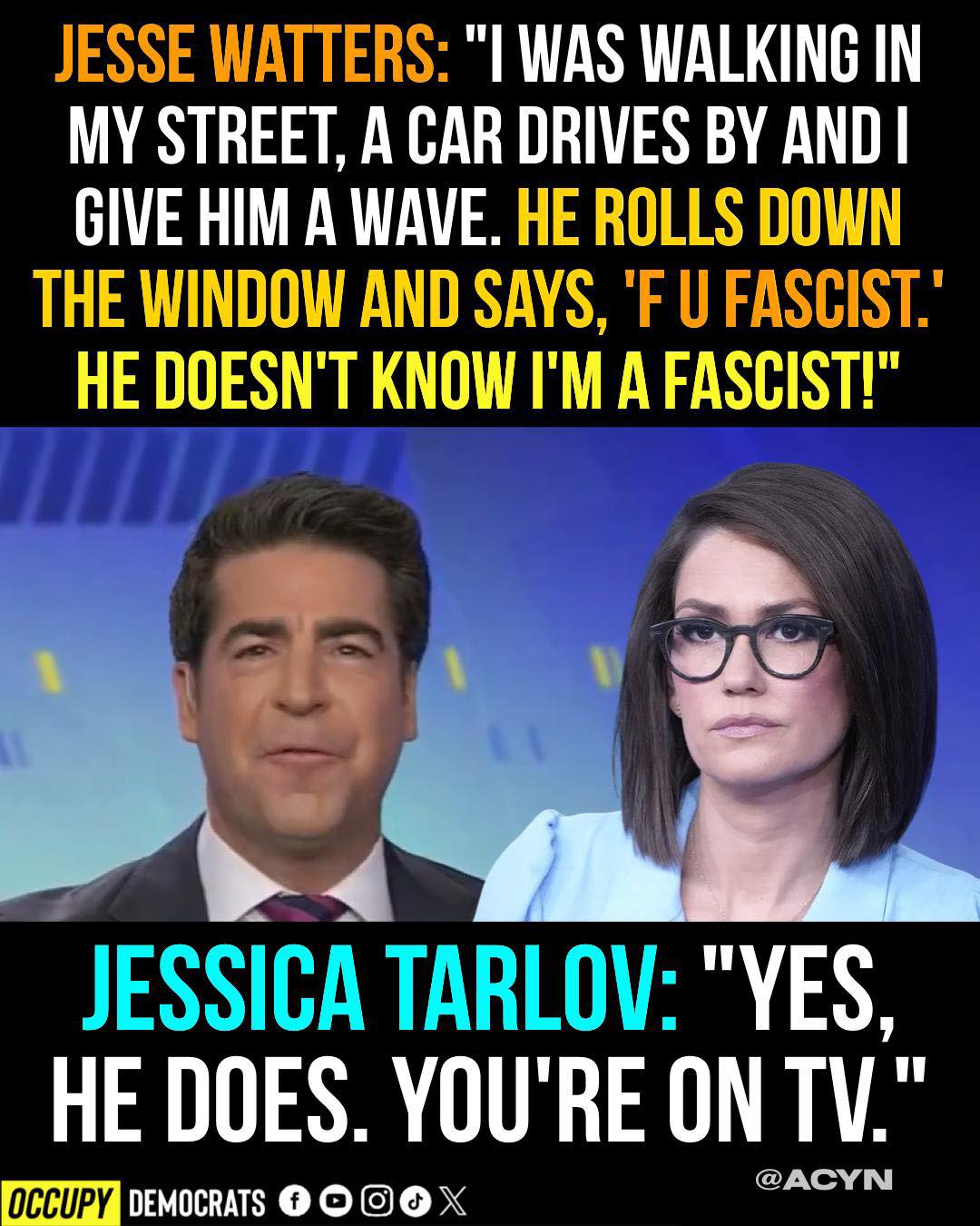 The moment began when Watters recounted a story of a stranger shouting a “fascist” slur at him while he was walking down the street. Watters attempted to play the incident off as a joke, mockingly telling the audience that the stranger didn’t realize he was “in on the secret.”