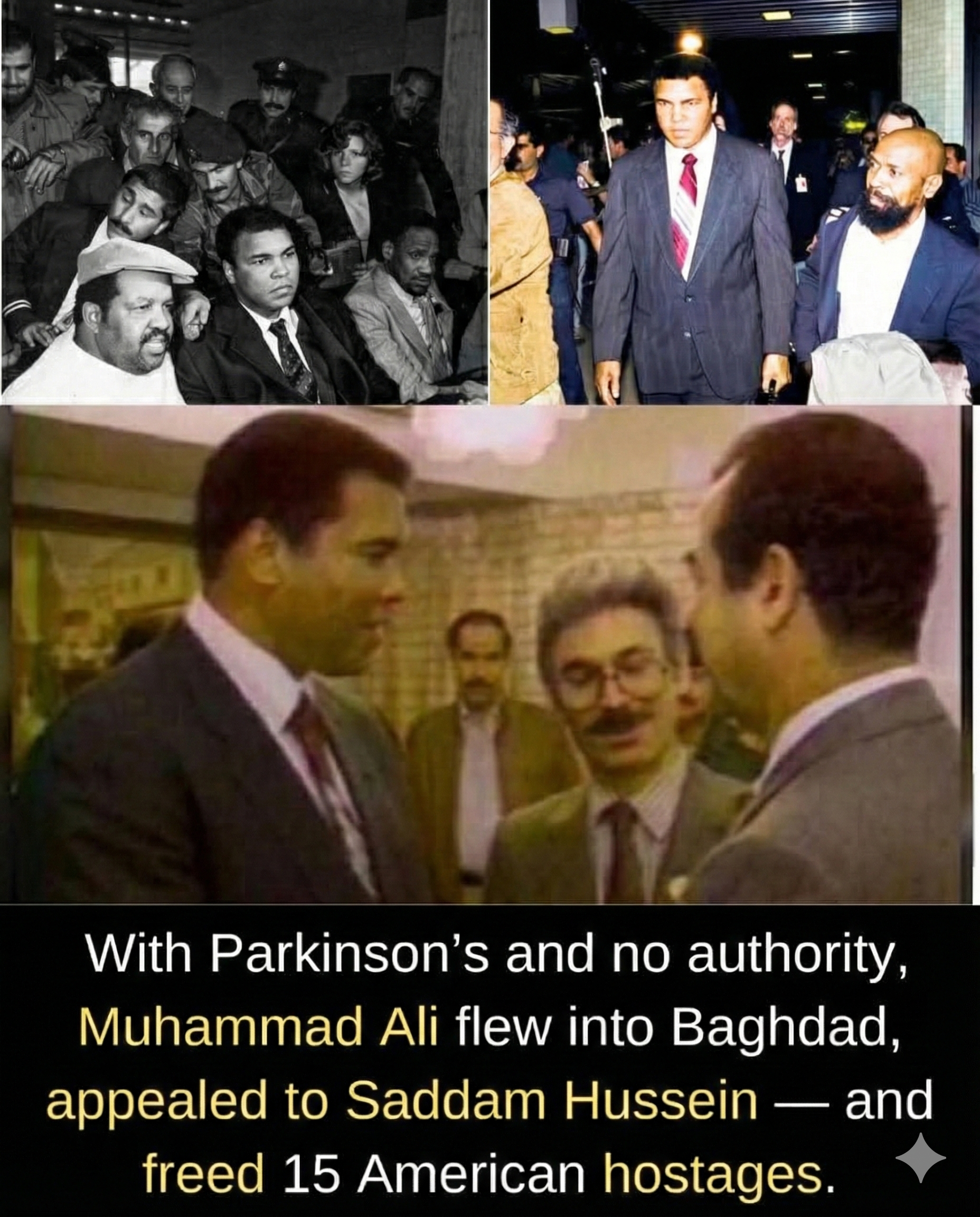 At the height of the Gulf crisis in 1990, as tensions between Iraq and the United States escalated, an unexpected figure stepped onto the diplomatic stage: Muhammad Ali. The former heavyweight champion, already living with Parkinson’s disease, traveled to Baghdad on a private humanitarian mission aimed at securing the release of American hostages detained following Iraq’s invasion of Kuwait.