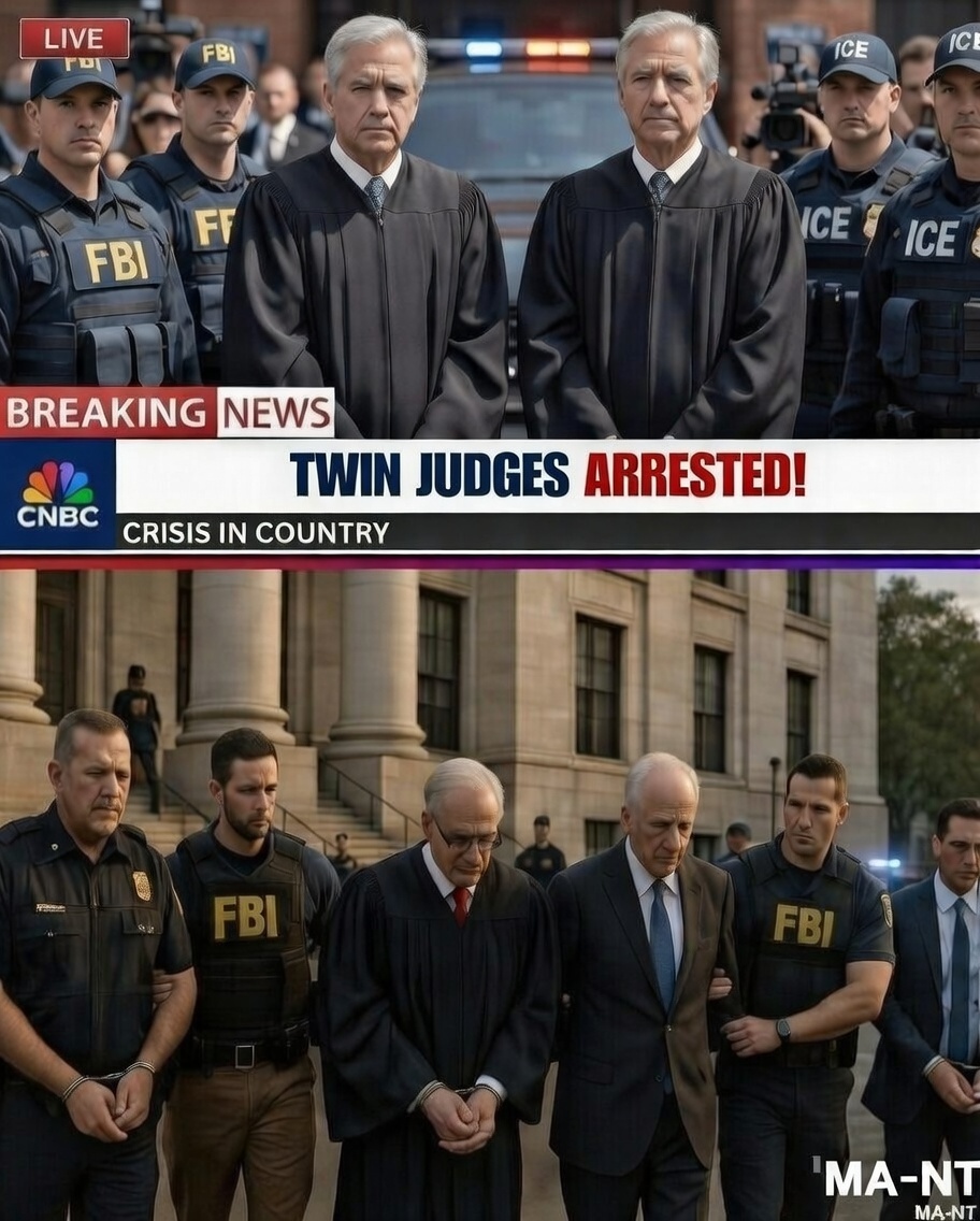 A dramatic federal operation unfolded today outside a major government building, where two high-profile twin judges were taken into custody under heavy security presence. The arrests, carried out in broad daylight, drew immediate public attention as federal agents escorted the long-serving judicial figures through a secured perimeter while onlookers gathered nearby.