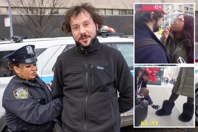 Their original crime unfolded when one of the goons – pictured wearing a bright red MAGA hat, a navy blue jacket, and a green scarf – tried to speak to the victim and leaned in to kiss her around 2:50 p.m. at West 26 Street and 7th Avenue, police said.