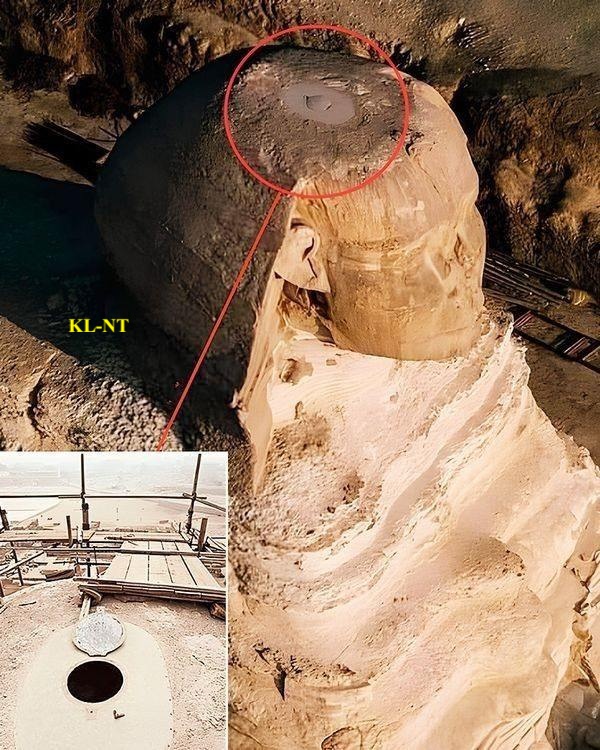 Engineering Stability: During conservation efforts in the 20th century, engineers and archaeologists created several shafts and access points—including the one on the head—to monitor the internal stability of the limestone and to pump in specialized mortars to reinforce the structure from the inside out.