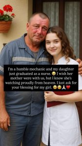 Ivan was a humble mechanic. His hands were permanently stained with the indelible marks of his trade—grease, oil, and the deep calluses forged by two decades of turning wrenches and lifting heavy engines. Next to his daughter, Elina, radiating in her crisp, pristine registered nurse’s uniform, Ivan’s rough exterior stood as a testament to pure, unadulterated sacrifice.