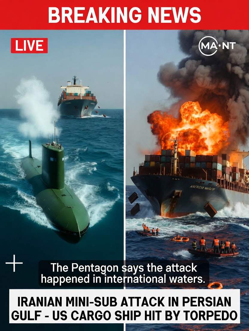 Persian Gulf — A U.S.-flagged cargo vessel was seriously damaged after a suspected torpedo strike launched from an Iranian mini-submarine in one of the Gulf’s busiest shipping corridors, triggering a swift response from the U.S. Navy. The incident unfolded at dawn when crew members reported a powerful underwater explosion that tore into the hull near the engine room.