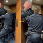 Police officers apprehending a man next to two police vehicles.