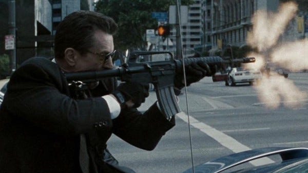 That diner scene? Two legends, one table, no guns, just raw truth. You can feel the air crackle. Then the bank shootout turns downtown into a war zone: echoing M4s, civilians screaming, glass raining like judgment day. It’s still the greatest urban firefight ever filmed, period.