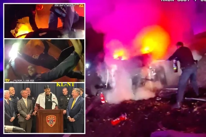 Bodycam footage of police officers rescuing Kervens Lesperance from a burning car after a crash.He was assisted on the scene by Officers Robert Rosciano, Michael Renna, Robert Stroehlein and Joseph Nofi, who all helped put out the flames and pull Lesperance to safety.