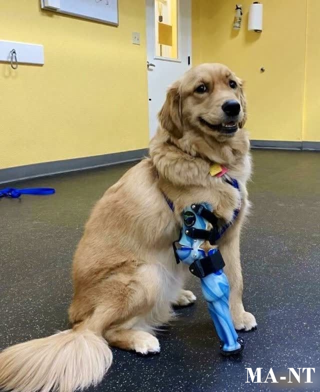 In a quiet therapy room with soft yellow walls, a Golden Retriever named Max sits with quiet dignity. His thick golden coat glows under the light, his warm brown eyes hold a gentle wisdom, and a bright smile spreads across his face as if he knows a secret the world has yet to learn. Strapped gently to his chest is a custom harness, and extending from his right front leg is a striking blue prosthetic—sleek, futuristic, almost playful in its color, yet born from necessity and pain.