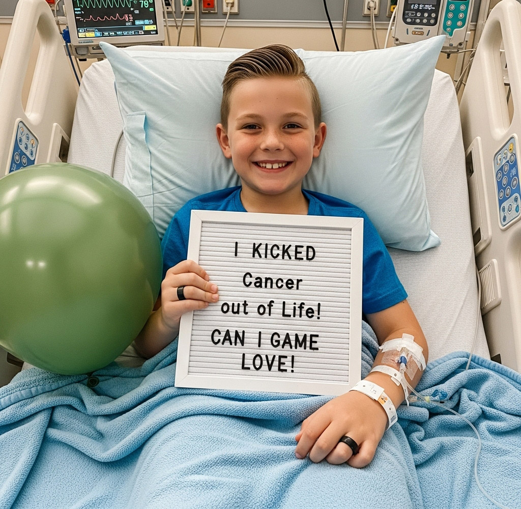 The atmosphere in Michael’s hospital room was electric, charged with the palpable relief of a massive, hard-fought victory. There he was, sitting up in his hospital bed, his face alight with a triumphant smile. He held up a sign declaring the incredible news: he had successfully kicked cancer “out of life.” Beside him bobbed a huge, vibrant green balloon, symbolizing the fresh, full breath of air he could finally take. All he was asking for was a little love to celebrate his freedom.