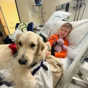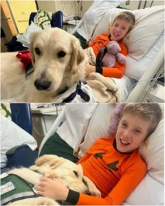The dog’s visits quickly became one of the highlights of James’s hospital routine. Through playful nudges, quiet cuddles, and gentle companionship, Dusty offered emotional support that words alone could not provide.