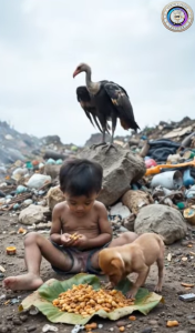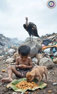 The boy in the landfill represents a reality that often goes unseen. His meal is not prepared in a kitchen or served on a table. It is found, gathered, and preserved in whatever way possible.