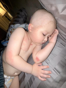 As seen in the photo, Asher’s skin shows signs of irritation and rashes—common reactions during treatment. These visible marks are a reminder of the invisible battle happening inside his body.