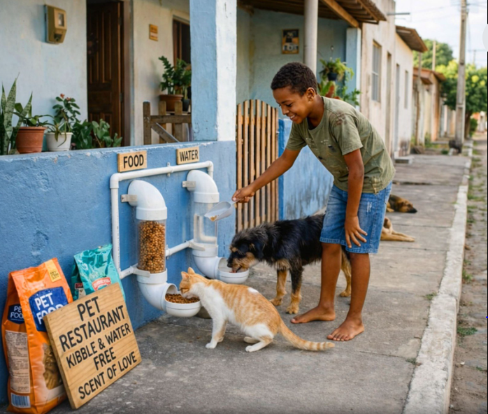Instead of watching stray animals wander hungry through the streets, this young boy decided to take action. Using basic PVC pipes, recycled materials, and pure creativity, he built what he calls a “pet restaurant” right outside his home. It’s not fancy, but it’s life-changing.