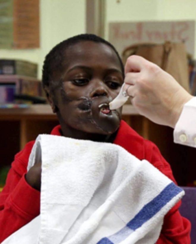 He suffered severe facial injuries — losing his lips and parts of his cheek and ear. For a child so young, the trauma was unimaginable, both physically and emotionally.