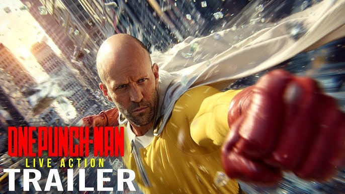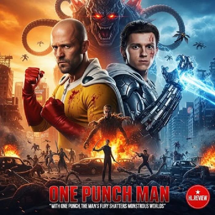 Sirens shred City Z as a Dragon‑level threat turns blocks to dust. Genos (Tom Holland) rockets in—ion cannons blazing—only to meet a bored guy in a bargain hoodie carrying discounted leeks. Saitama (Jason Statham) sighs, drops the groceries, and the shockwave scrubs the sky.