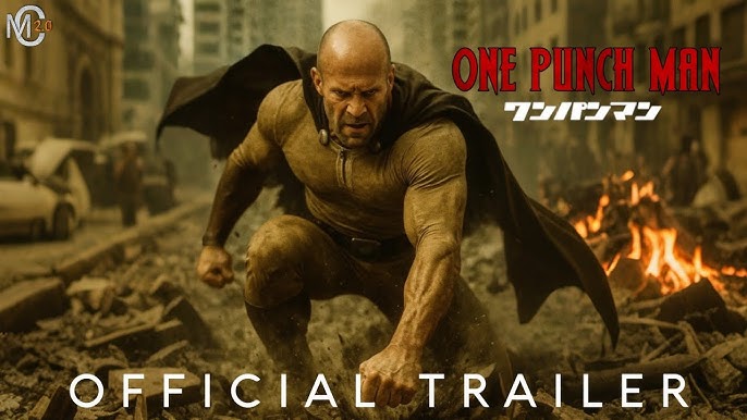 Sirens shred City Z as a Dragon‑level threat turns blocks to dust. Genos (Tom Holland) rockets in—ion cannons blazing—only to meet a bored guy in a bargain hoodie carrying discounted leeks. Saitama (Jason Statham) sighs, drops the groceries, and the shockwave scrubs the sky.