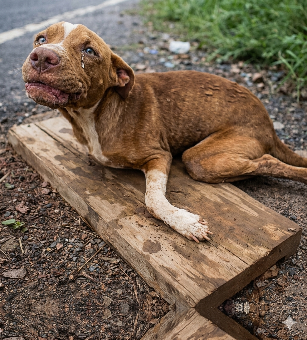 On the side of the road, barely noticeable, a tiny dog lay curled on a worn piece of plywood—motionless, silent, as if the world had already forgotten him. 🚗