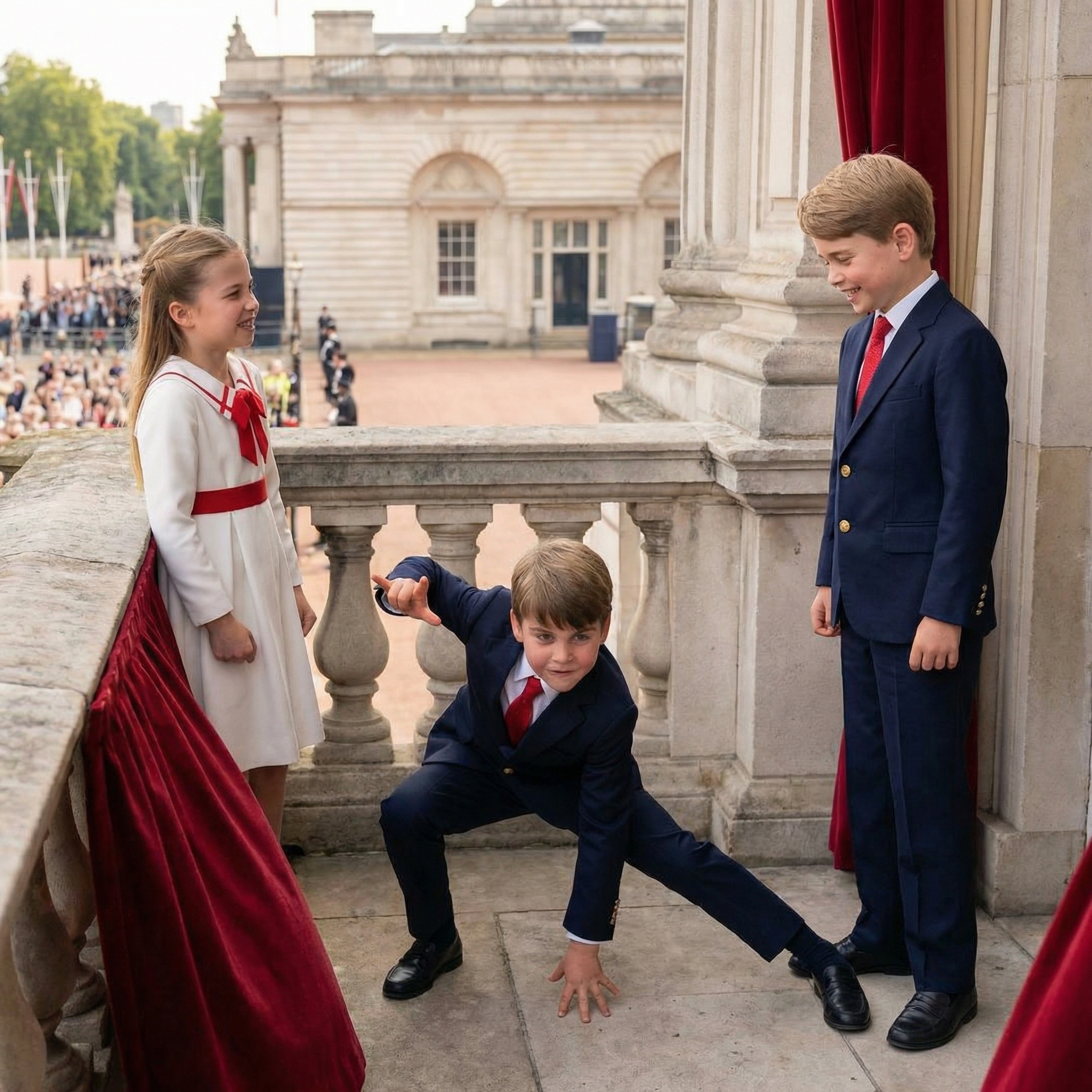 Dressed in a sharp navy suit and a bold red tie, Louis looked every bit the young prince—until he started making faces! From mimicking pilots to playfully interacting with the crowd, he has built a reputation for being the delightfully unpredictable heartbeat of the monarchy.
