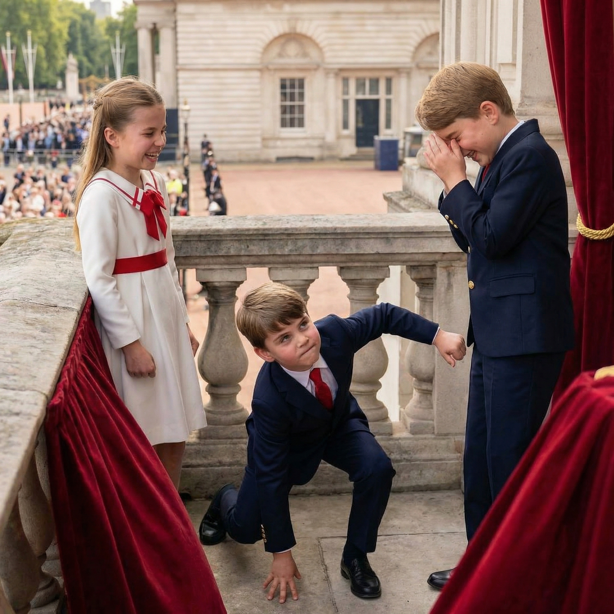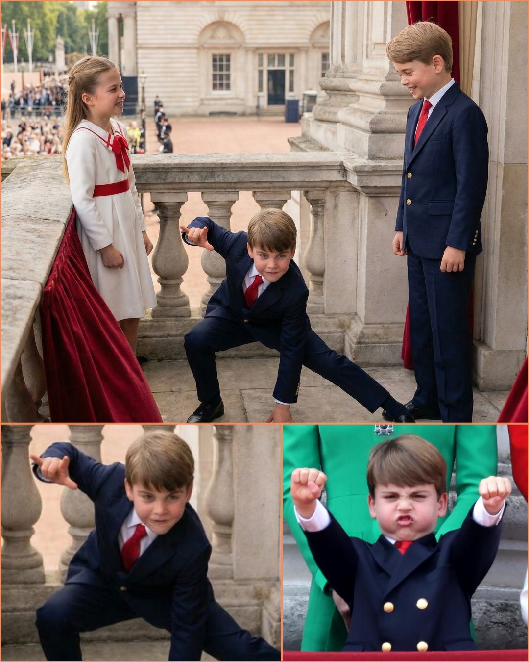 While the event was meant to be a solemn tribute to King Charles’s official birthday, Louis had other plans. With a repertoire of cheeky expressions and boundless energy, he turned the traditional carriage ride into a comedic highlight. Watching from his seat, Prince George was seen multiple times covering his mouth, failing to maintain his “future King” composure while his little brother worked the crowd. 🤣