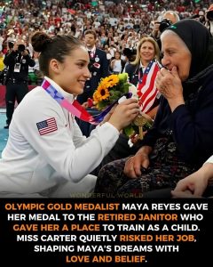 The moment Maya reached her, the world witnessed an unforgettable act of gratitude. Ignoring the chaos and the celebration, Maya gently placed the heavy, shining gold medal into Miss Carter’s hands—hands that had scrubbed floors and now held the tangible symbol of a dream they had built together.