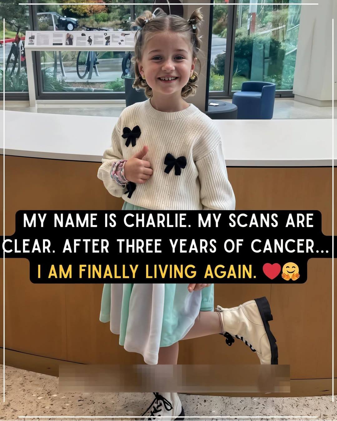 That simple, life-altering phrase—”scans came back clear”—is the ultimate sound of victory. Charlie’s beaming smile in the picture tells a story that words can barely capture: a story of resilience, triumph, and the beginning of a future brimming with light.