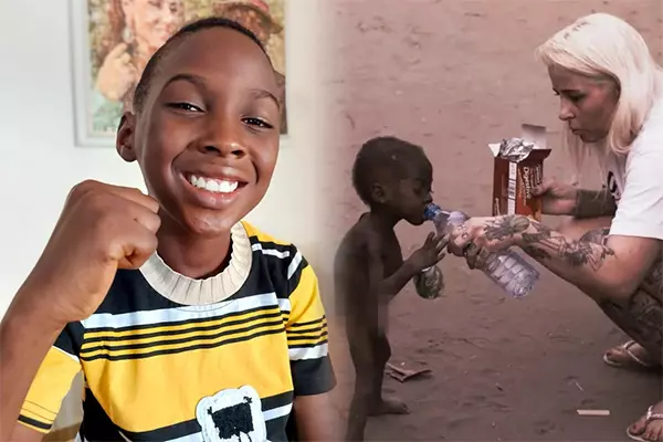 Just one year later, in February 2017, the transformation was nothing short of miraculous. Hope, once a frail and forgotten child, proudly stood in a red jumpsuit, white sneakers, and a black backpack for his very first day of school.