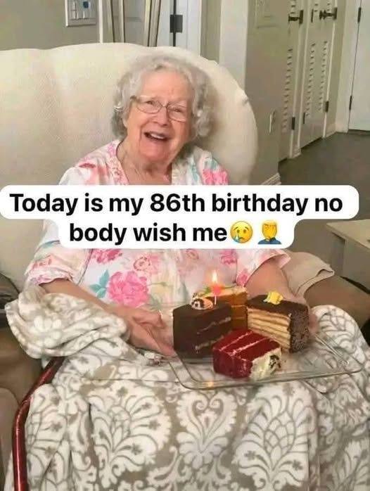 The devastating text overlay is the cause of her grief: “Today’s my 86th birthday, but I’m sad that no one wished me.”
