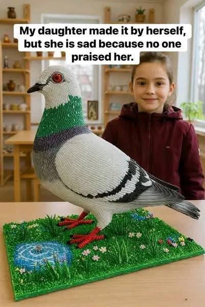 In a world of mass-produced toys and digital screens, something extraordinary was born from a pile of simple materials and a young girl’s imagination. For days, this young artist sat in quiet concentration, her small hands moving with the precision of a master craftsman. She was working on a vision: a magnificent, lifelike sculpture of a pigeon, perched peacefully upon a patch of green grass dotted with tiny flowers.