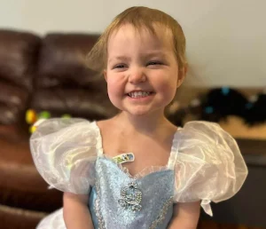 She loves princesses—the magic, the sparkle, the stories that bring light into her world. She carries a purple blanket that offers comfort, something familiar she can hold onto when everything else feels uncertain.