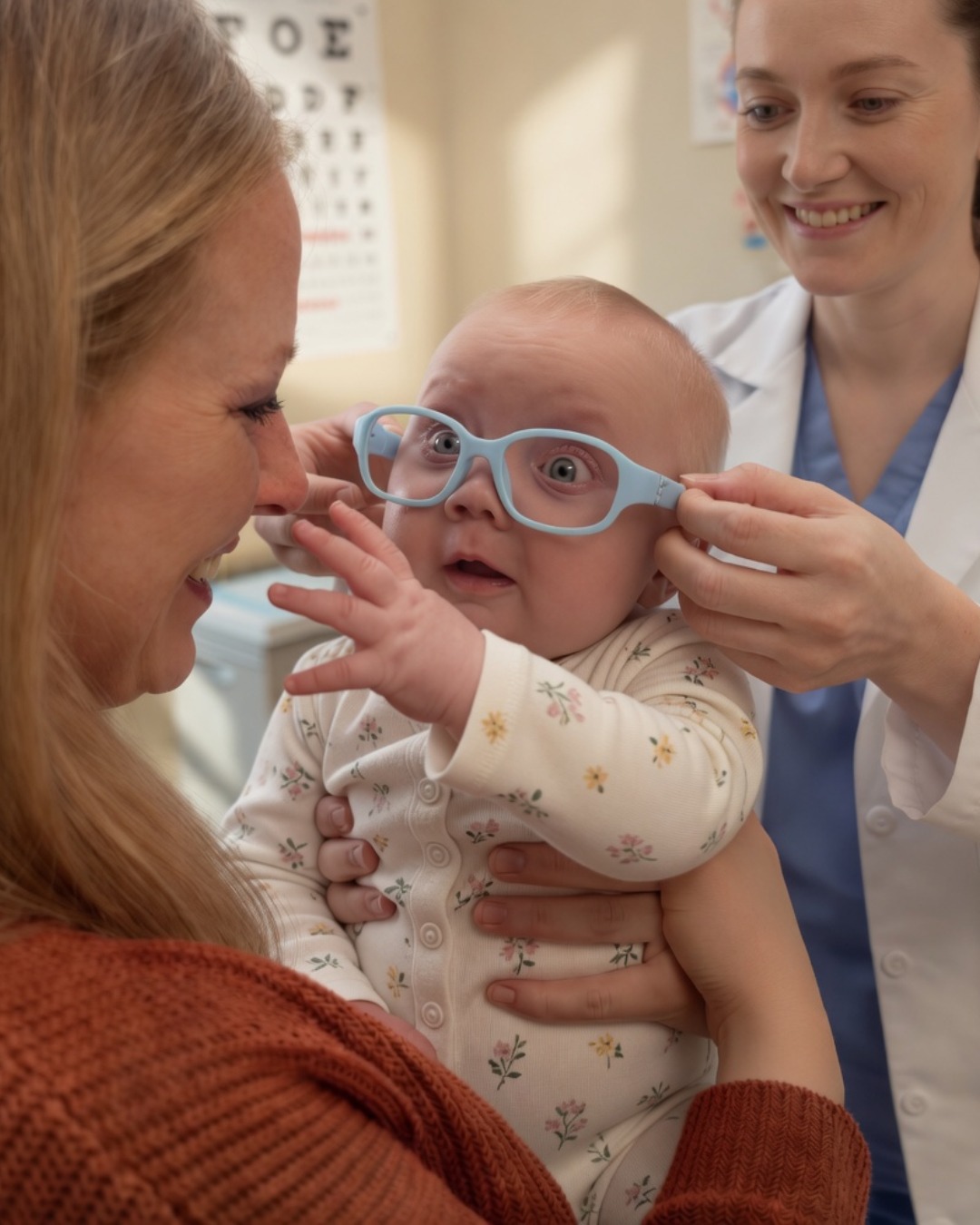 During the visit, the doctor gently examined him and then introduced a small pair of soft blue glasses designed for infants. With calm reassurance, the glasses were carefully placed on Ollie’s tiny nose.