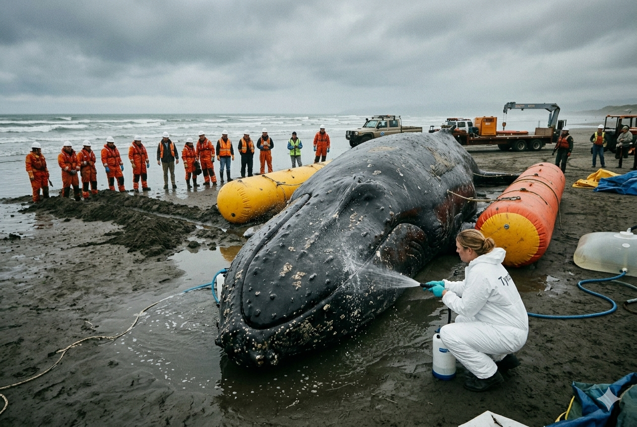 The whale’s immense bulk requires meticulous coordination between the rescuers, and each step of the recovery process is executed with precision. Workers know that the operation could make the difference between life and death for the animal, and they push forward with determination despite the mounting pressure.
