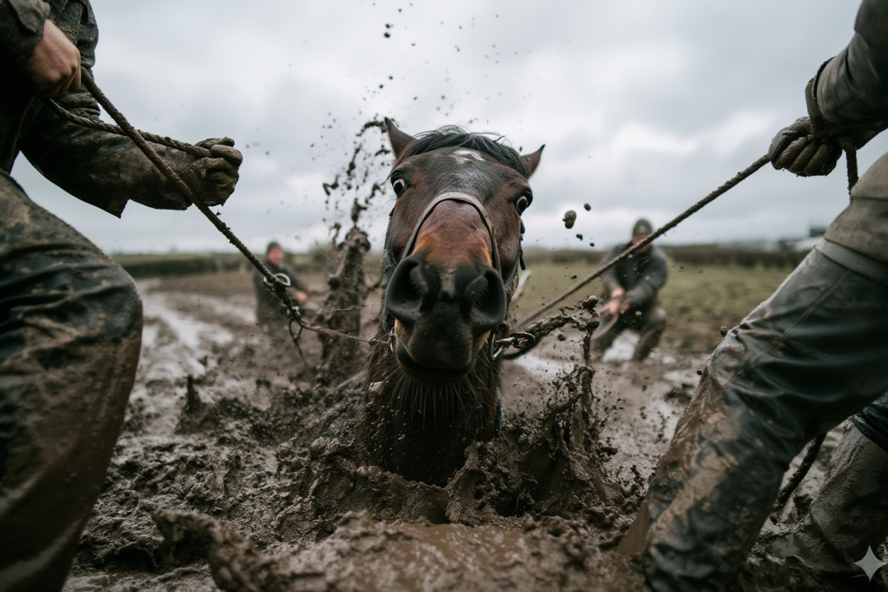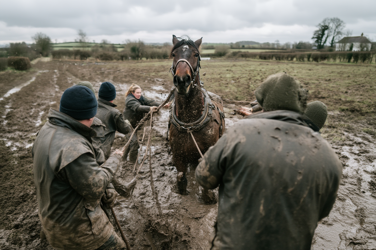 In one scene, a horse is trapped in thick, sticky mud in the middle of a field, struggling with every movement to break free, only to be pulled deeper into the earth. The rescuers move in, ropes in hand, but the ground is slick and unpredictable. Their boots slide in the mud, and every tug brings the danger of making things worse. The raw footage captures it all — shaky, unfiltered, and painfully real. With each pull, the horse’s fate hangs by a thread.
