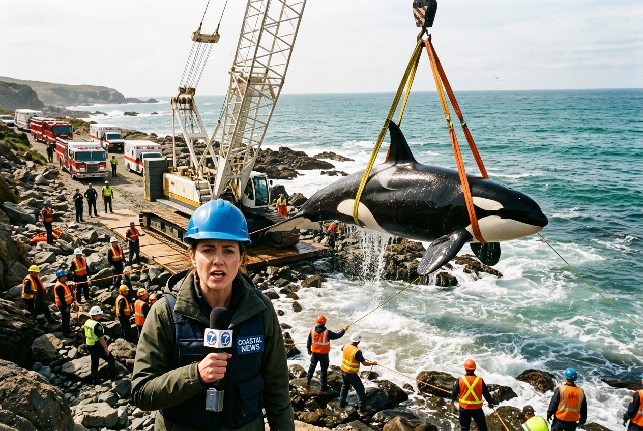 A news anchor, outfitted in a hard hat, reports from the rocky beach, providing live updates as the operation unfolds. The scene is intense, with workers in high-visibility vests moving with incredible focus and accuracy. The enormous whale, weighing several tons, is being suspended in mid-air as the massive crane begins its slow, calculated lift.