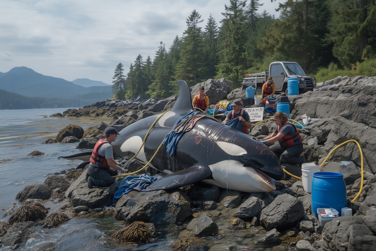 A stunning and heart-pounding rescue operation is underway as a giant orca, stranded along a rocky coastline, receives urgent care and a powerful, full-strength effort from a team of marine rescuers. The majestic killer whale, measuring over 20 feet and weighing several tons, found itself trapped in shallow waters after straying too close to shore. With its survival hanging in the balance, a skilled and determined rescue team is now working tirelessly to save the giant predator from the brink of death.