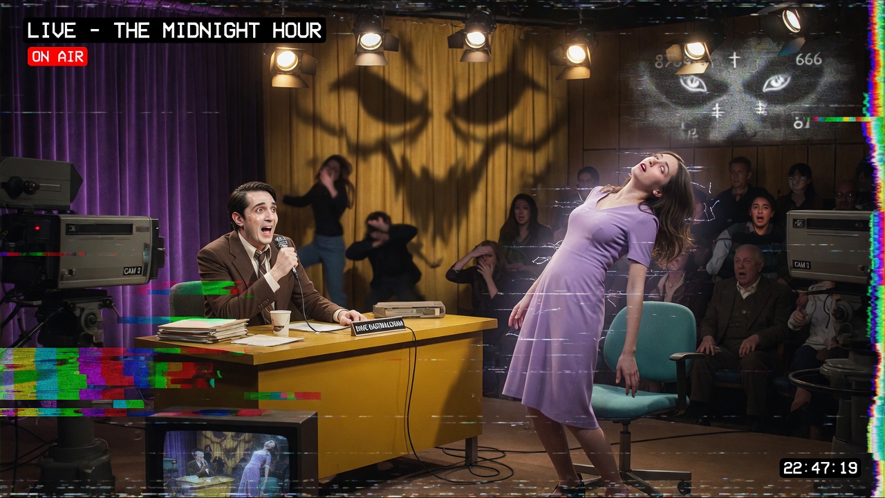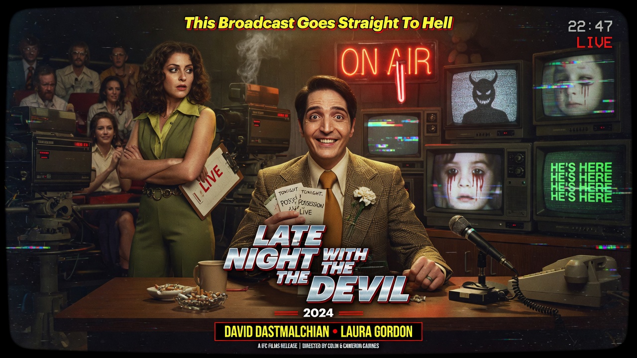 Step back into the eerie glow of 1977 television with Late Night with the Devil, a chilling found-footage style horror that turns a desperate Halloween special into pure nightmare fuel. David Dastmalchian delivers a haunting performance as Jack Delroy, the charismatic yet tormented host of Night Owls, a late-night talk show struggling after the tragic loss of his wife. Desperate for ratings, Jack invites controversial guests onto the live broadcast on October 31st.