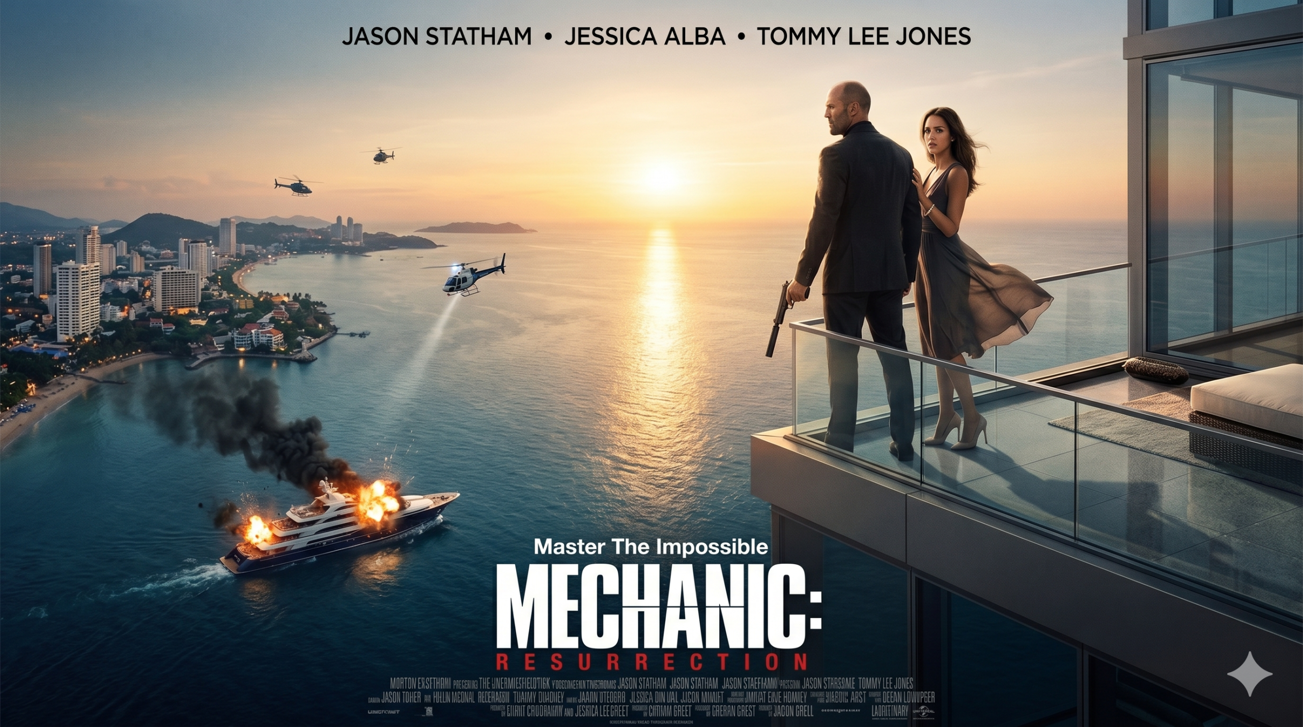 Jessica Alba stars as Gina Thornton, the beautiful and brave woman who becomes the ultimate leverage. To save her, Bishop must complete three seemingly impossible assassinations across the globe — an African warlord, a vicious human trafficker, and a powerful arms dealer played by Tommy Lee Jones as the cunning Max Adams.