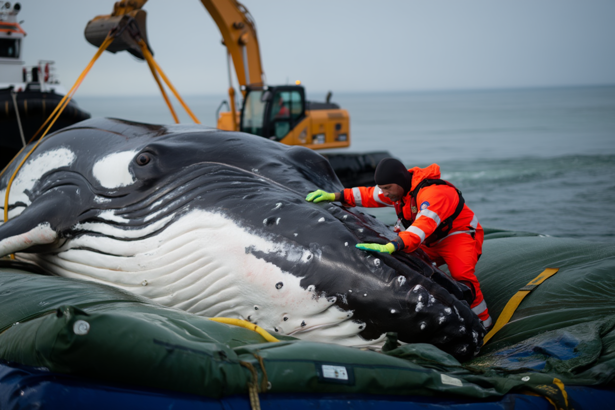 The convoy, guided by a tugboat, moves forward slowly. As the water level rises beneath him, Timmy’s massive body begins to show the first signs of buoyancy. The tarp supporting him starts to loosen, a sign that the air cushions are doing their job. But the team remains on high alert, watching every movement. Rescuers hold their breath, knowing how fragile this operation is. One small shift could mean disaster.