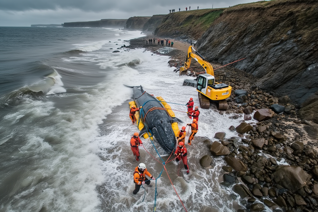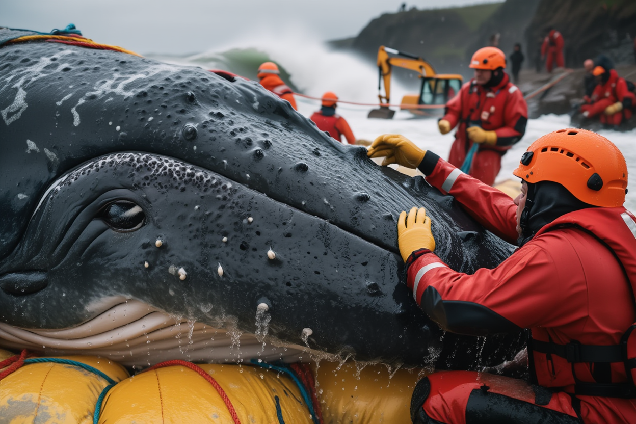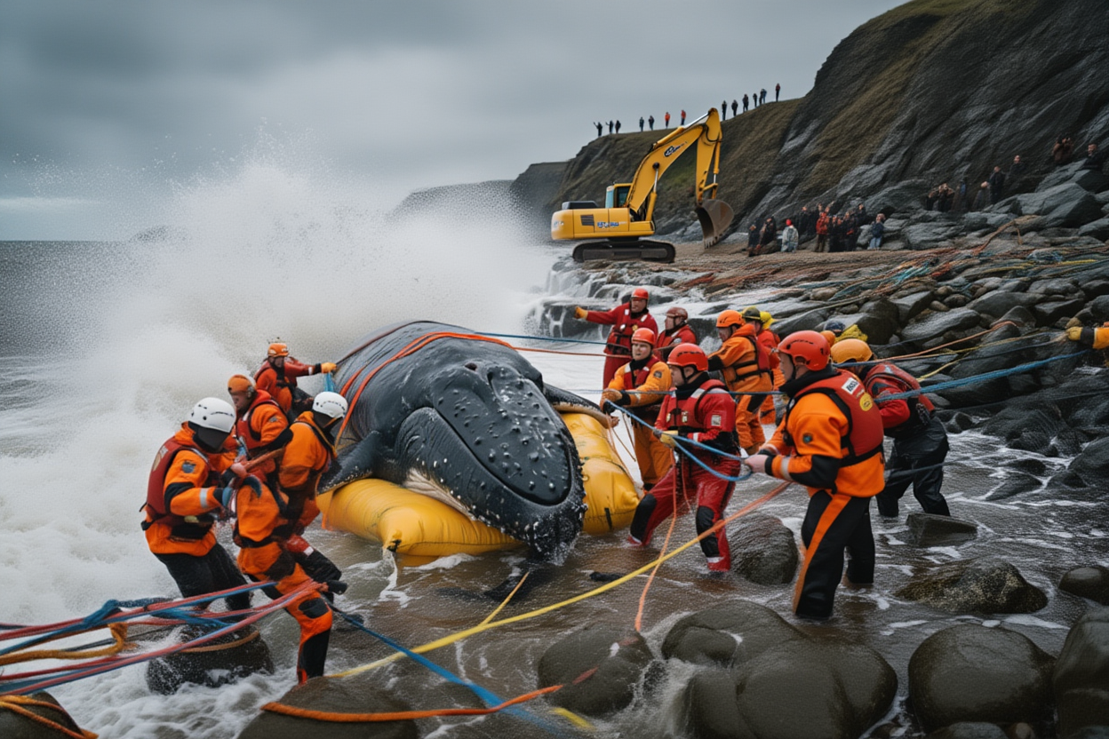 On a rugged and unforgiving coastline, a dramatic struggle unfolds as rescue teams battle against crashing waves to help Timmy, the stranded humpback whale, escape the shallows.