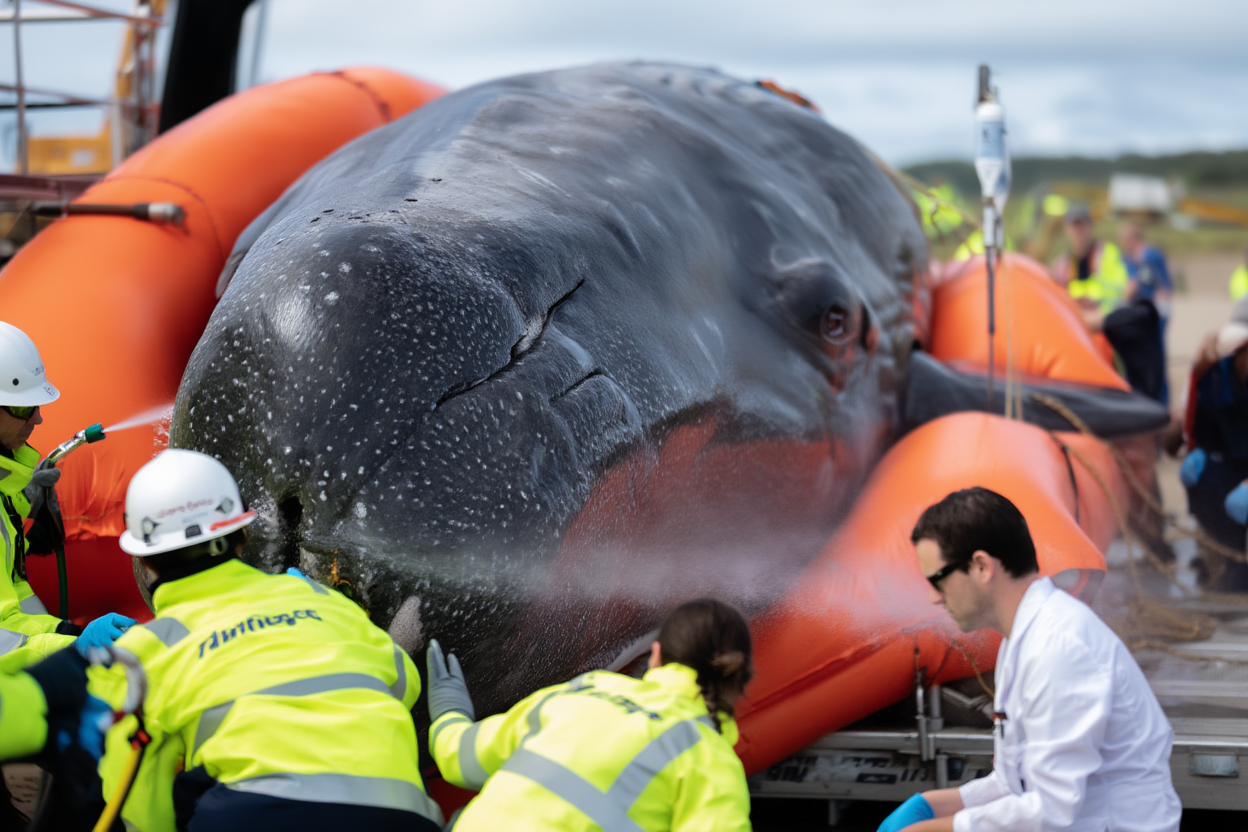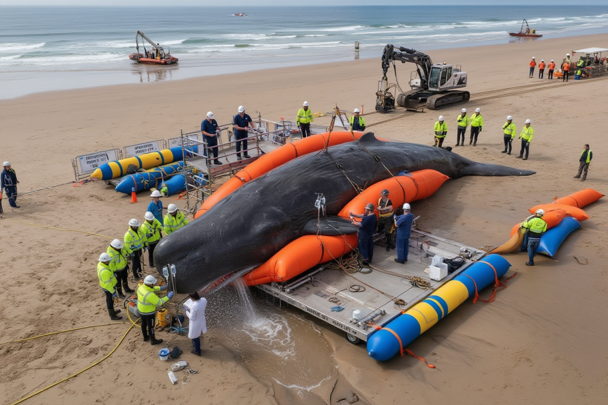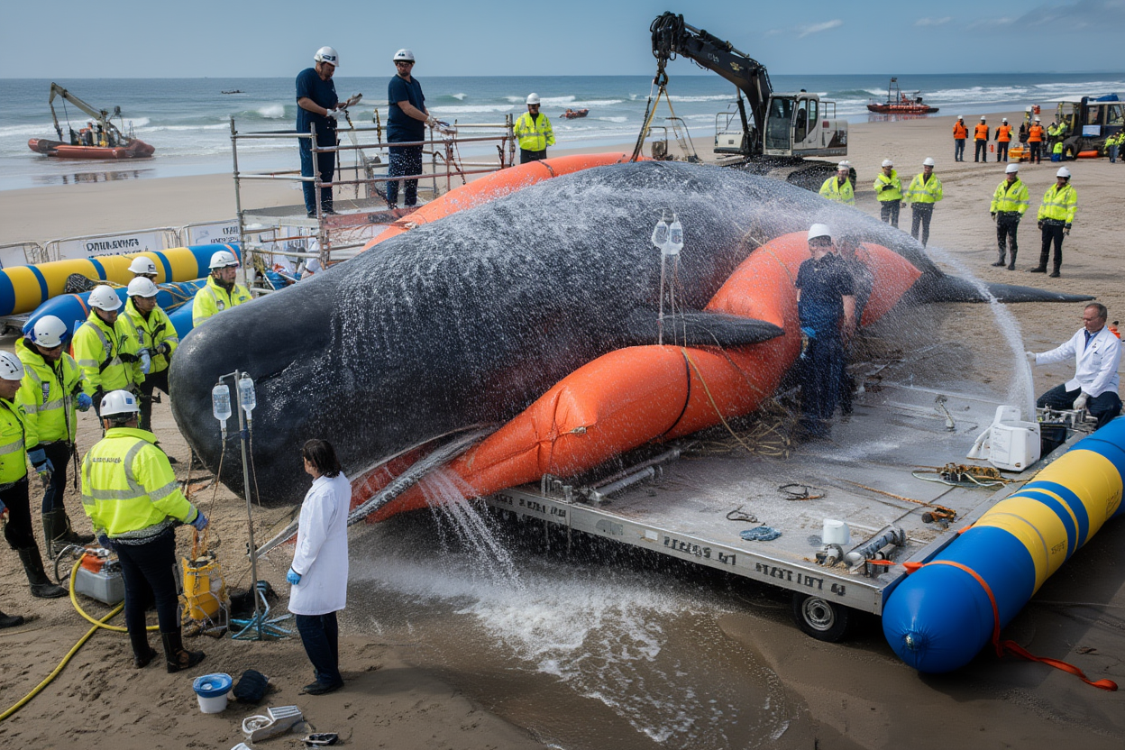 This operation is a historic first — a rescue of this magnitude has never been attempted before. The logistics, the scale, and the complexity of moving such a large and delicate creature make it one of the most challenging rescues in modern history. Every second counts. Every movement is critical.