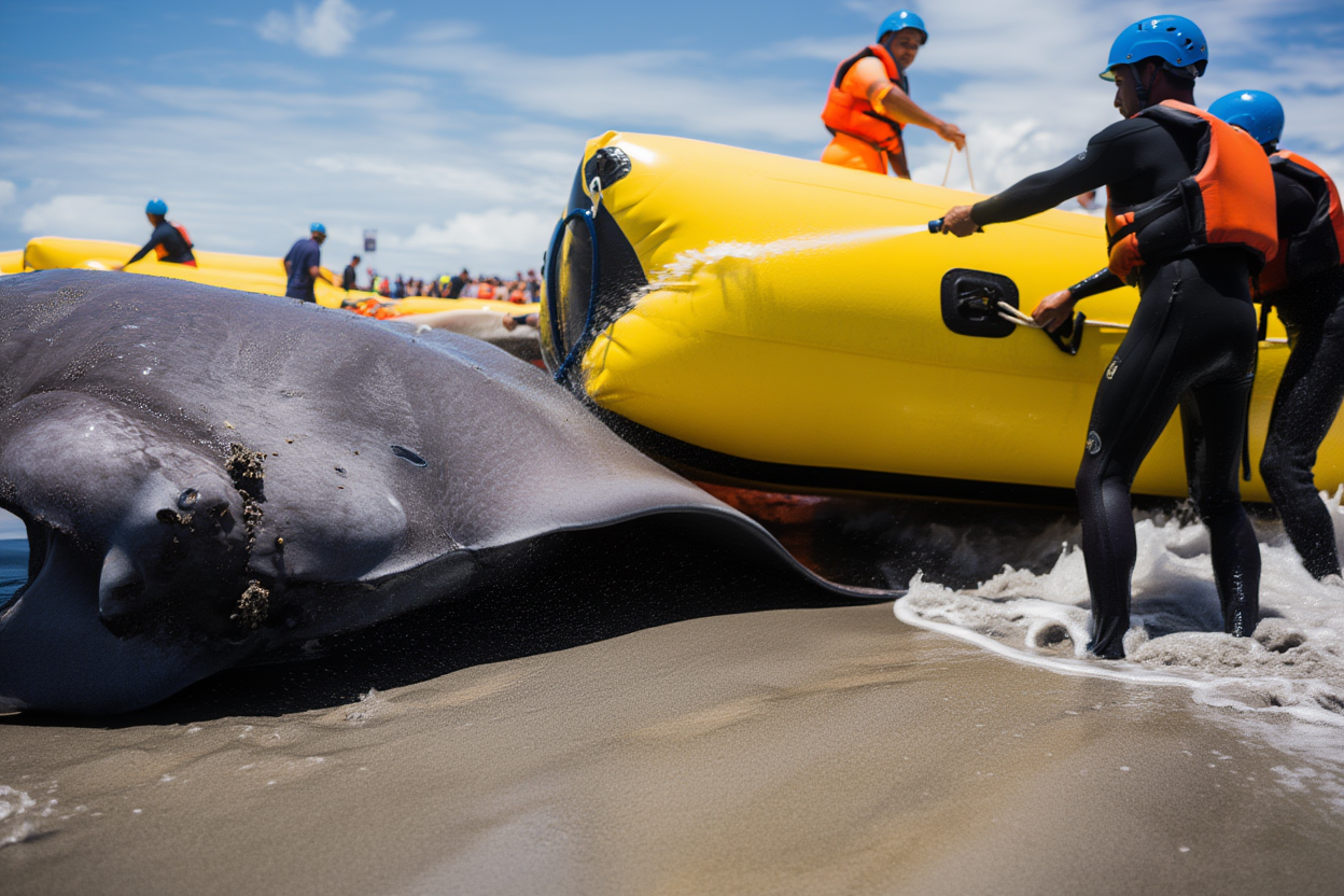 The rescue teams spring into action, dozens of workers pulling ropes, inflating massive yellow pontoons to cradle the whale’s enormous form, and constantly hosing its skin to keep it moist under the scorching sun. The heat and the strain of being stuck on land are taking a toll on the whale, but the team is determined to help. Each rescuer looks impossibly small compared to the sheer size of this living giant, but their effort is relentless.