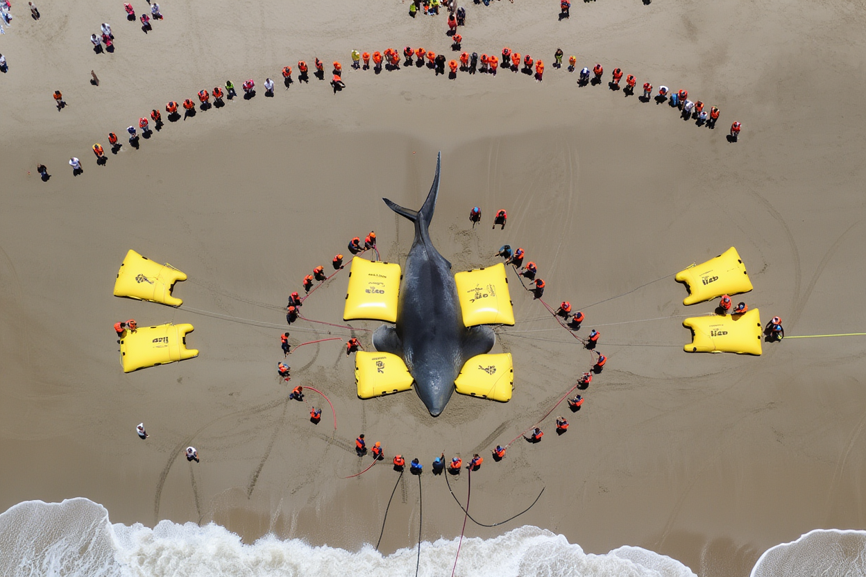 The clock is ticking as they work with urgency and precision, fighting against the rising tide and the heat of the sun. The whale’s life depends on this rescue — will they manage to push this ocean giant back into the sea before it’s too late?