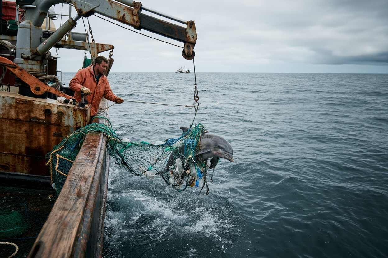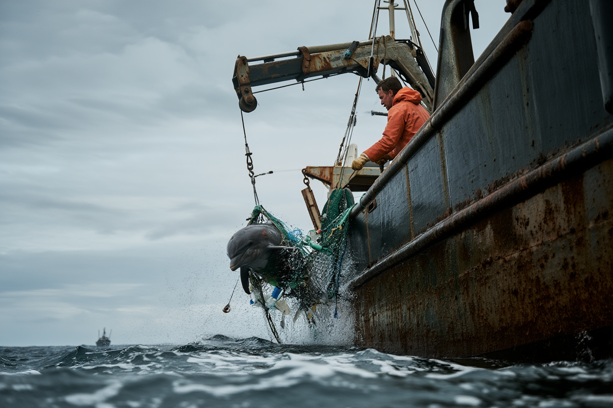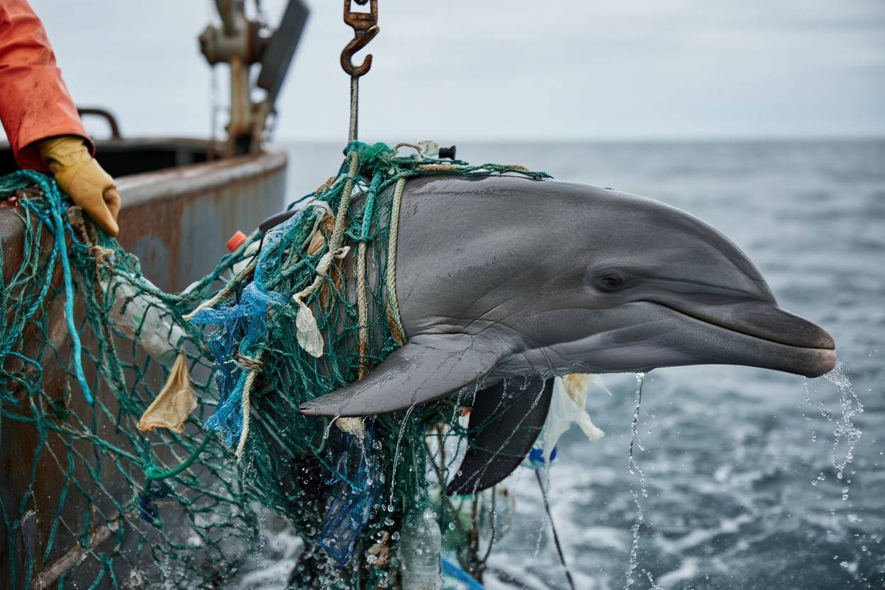 In a dramatic and heart-wrenching rescue, a beautiful dolphin hangs limp from a crane high above the stormy sea, its body completely entangled in deadly ghost nets. The nylon ropes slice into its fins, tail, and snout, causing deep wounds as it struggles against the suffocating entrapment.
