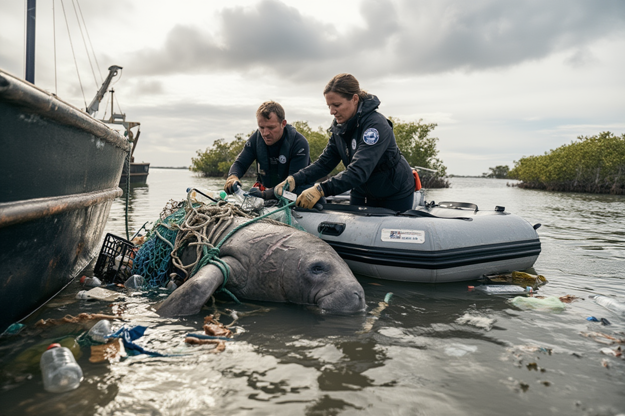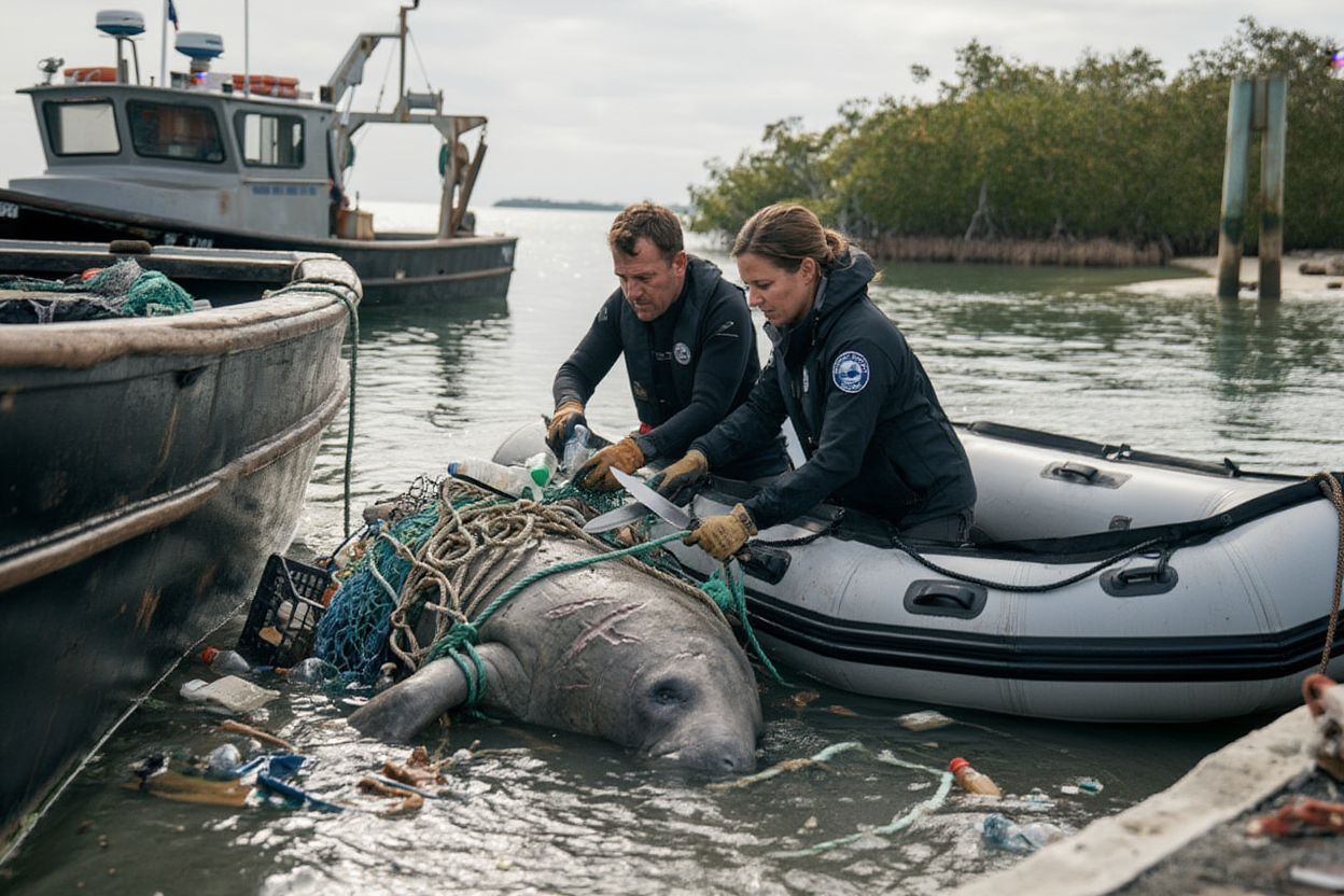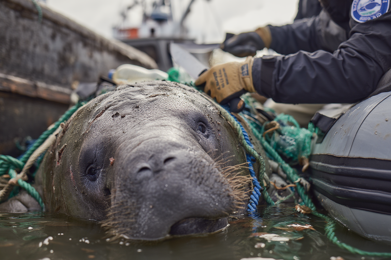 A heart-wrenching scene unfolds in the shallow bay as a massive manatee, exhausted and scarred, struggles to breathe. It’s completely tangled in thick fishing nets and ropes, its body trapped and suffocating as the waves lap around it. Every breath is a fight for survival.