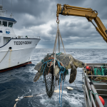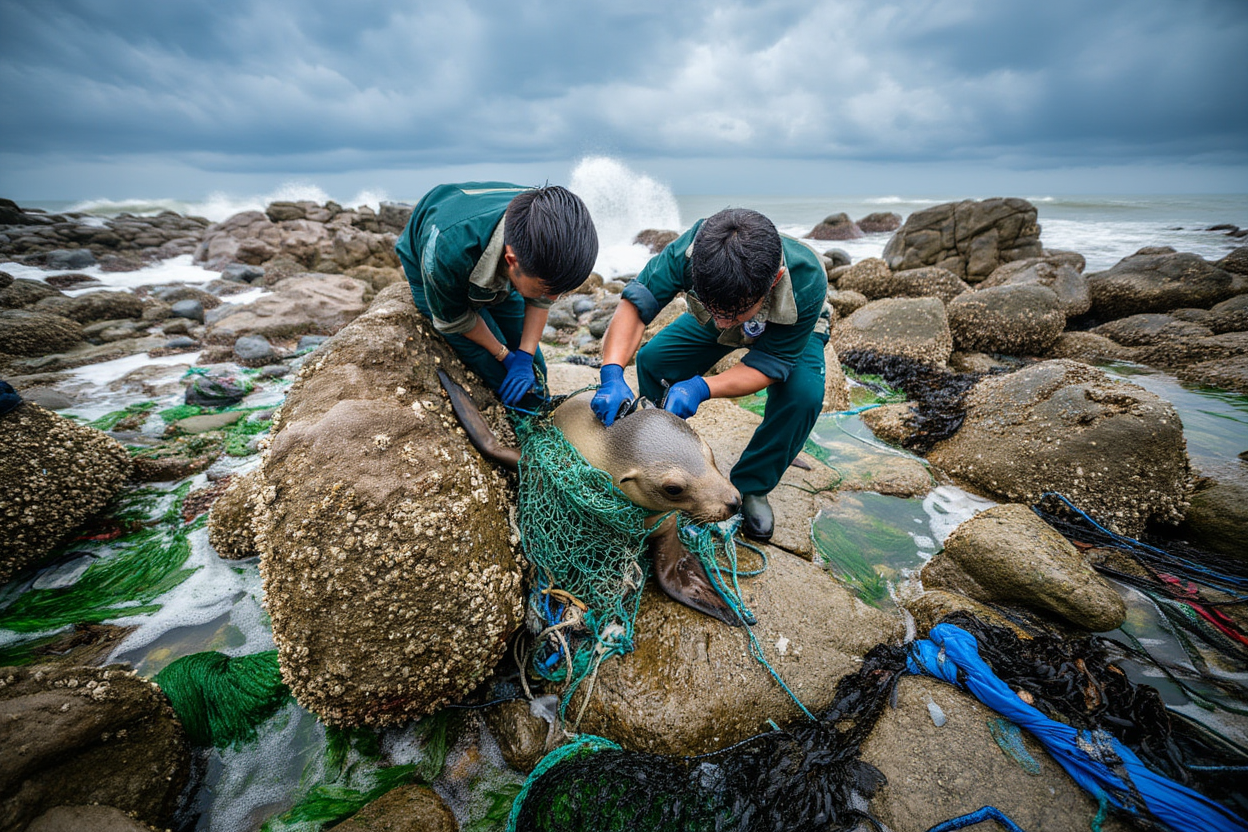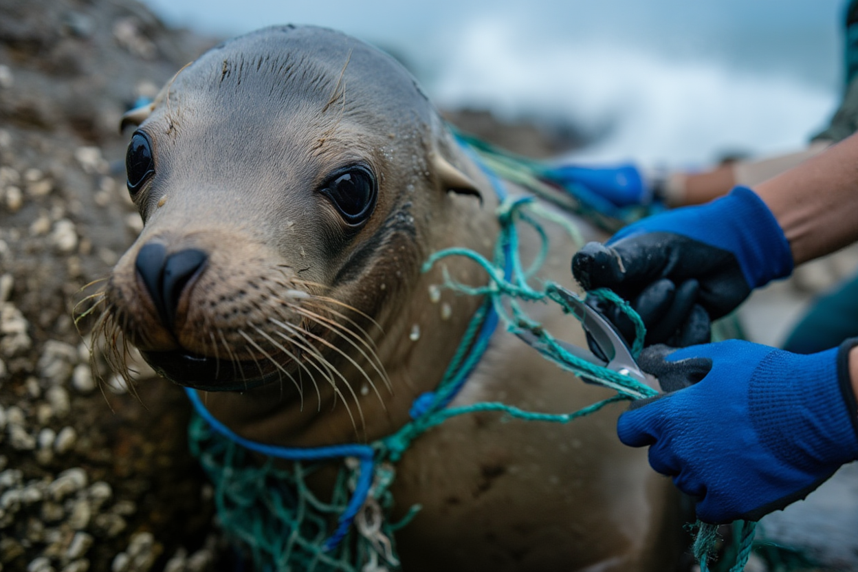 A scene of pure chaos unfolds on the jagged, rocky coastline, where a powerful sea lion is trapped in thick green fishing nets. With each crashing wave, the tide rises fast, threatening to drown the helpless animal as it thrashes against its restraints. The roar of distress echoes over the tumultuous surf as the sea lion fights to break free, its body tangled in the deadly nets.